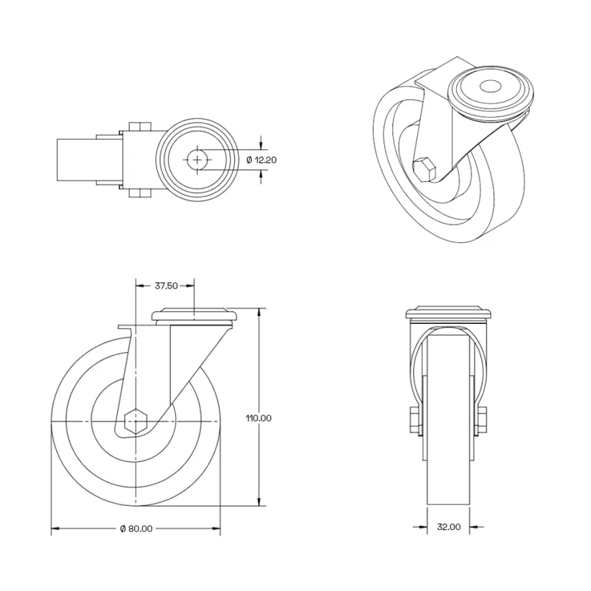 Dit elastisch rubberen zwenkwiel heeft een centraal gat, hierdoor kan dit wiel eenvoudig met 1 bout of expander worden vastgezet.