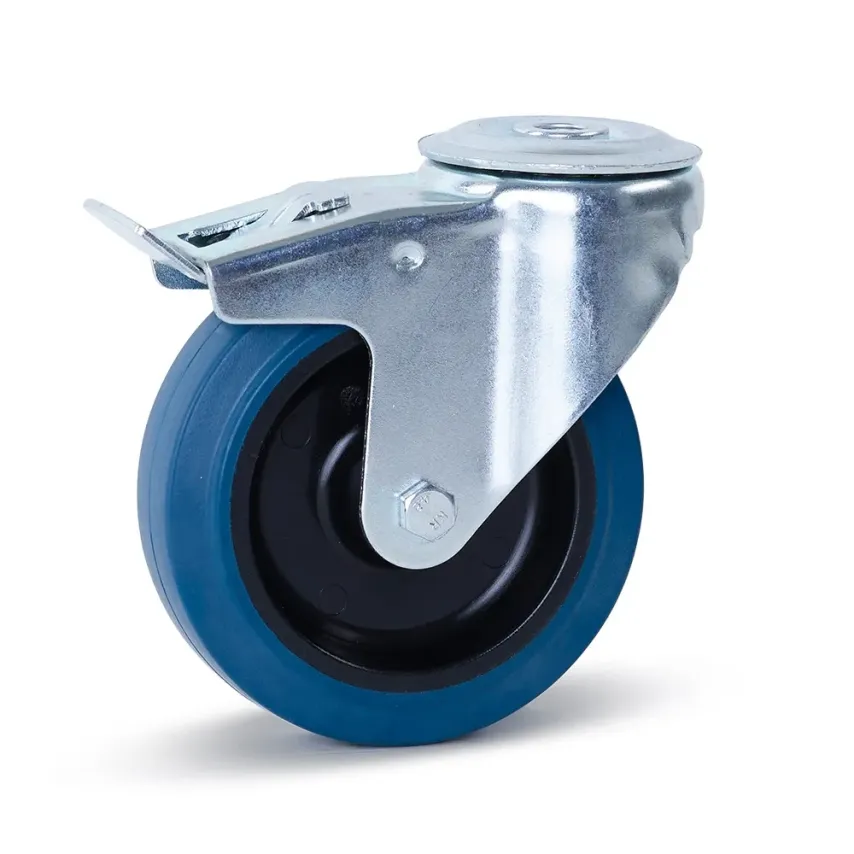 Dit blauw elastisch rubberen zwenkwiel met rem heeft een diameter van 125mm en een draagvermogen van 180 kg. De band van dit wiel is van elastisch rubber en de wielbody van nylon.