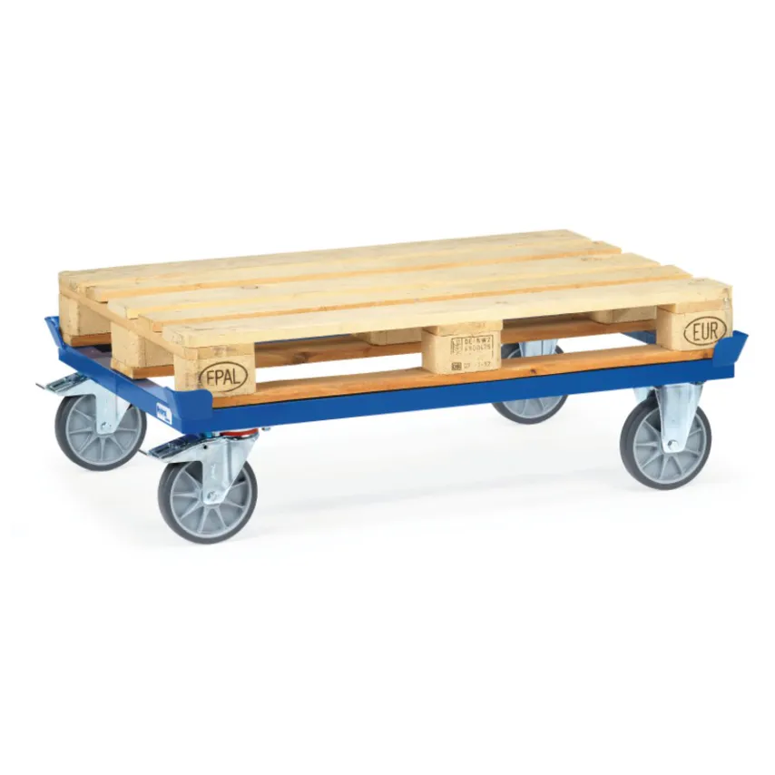 Voor pallets en gaasboxen. Robuust gelaste profielstalen constructie, met 4 vanghoeken, gepoedercoat, blauw RAL 5007. 2 Zwenk- en 2 bokwielen, TPE rubber, naaf met kogellager, 2 zwenkwielen met rem, Wielen voor middelzware belasting. Geruisarme loop.