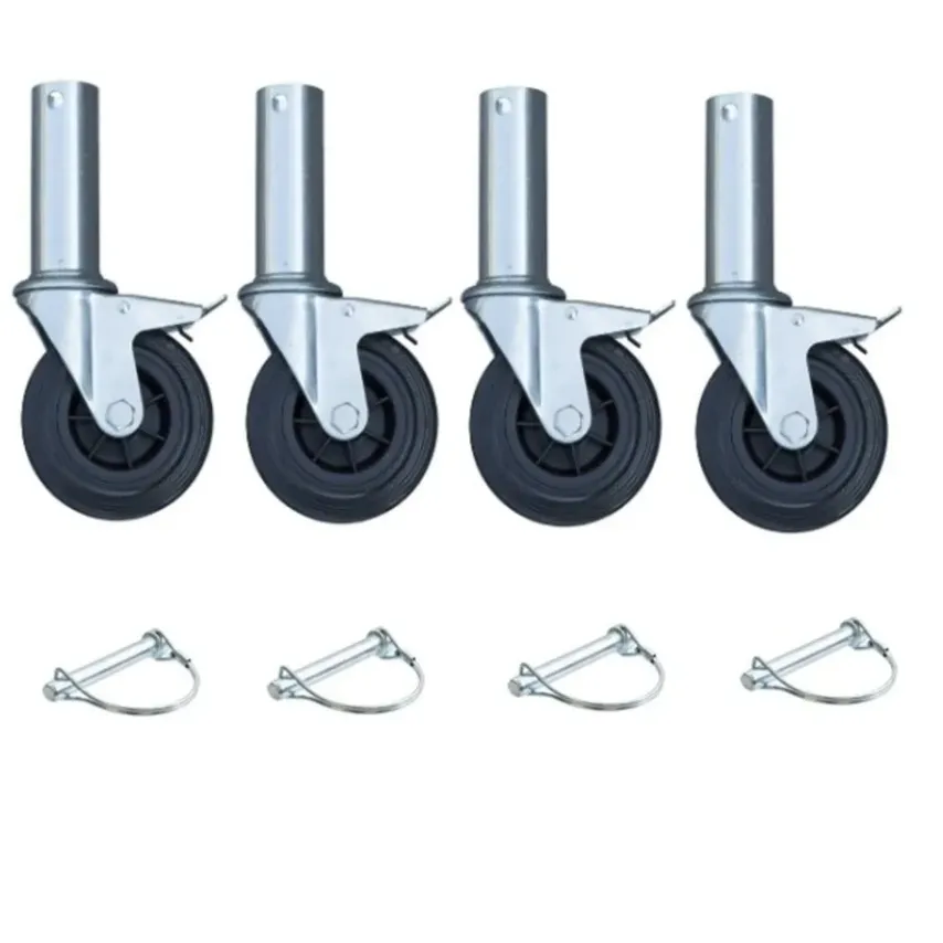 4 stuks 100 mm rubberen steiger wielen met gladde buis, diameter 46 x 125 mm en met 11 mm gat op 109 mm boven de draaikrans, voor buismaat binnendiameter 47/48 mm. Met borgclip. Draagvermogen 75kg per wiel.