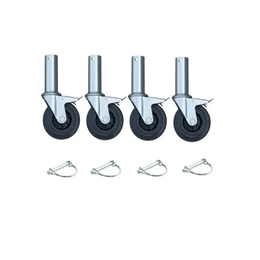 4 stuks 125mm rubberen steiger wielen met gladde buis, diameter 46 x 125 mm en met 11 mm gat op 109 mm boven de draaikrans, voor buismaat binnendiameter 47/48 mm. Met borgclip. Draagvermogen 120kg per wiel.