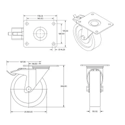 Zwaarlastwiel met rem met een diameter van 200 mm en een draagvermogen van 1.400 kg per wiel. Het wiel heeft een gietijzeren wielbody en de bandage is van PU ( Polyurethaan).